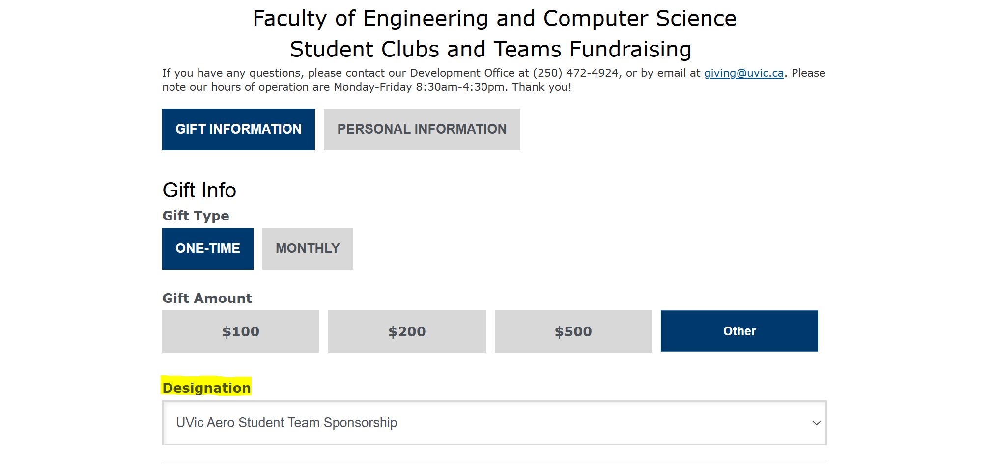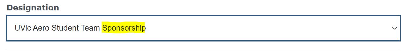 If your contribution is intended as a sponsors, please ensure that when navigating the club fundraising page, the designation drop down is set to “UVic Aero Student Team Sponsorship”