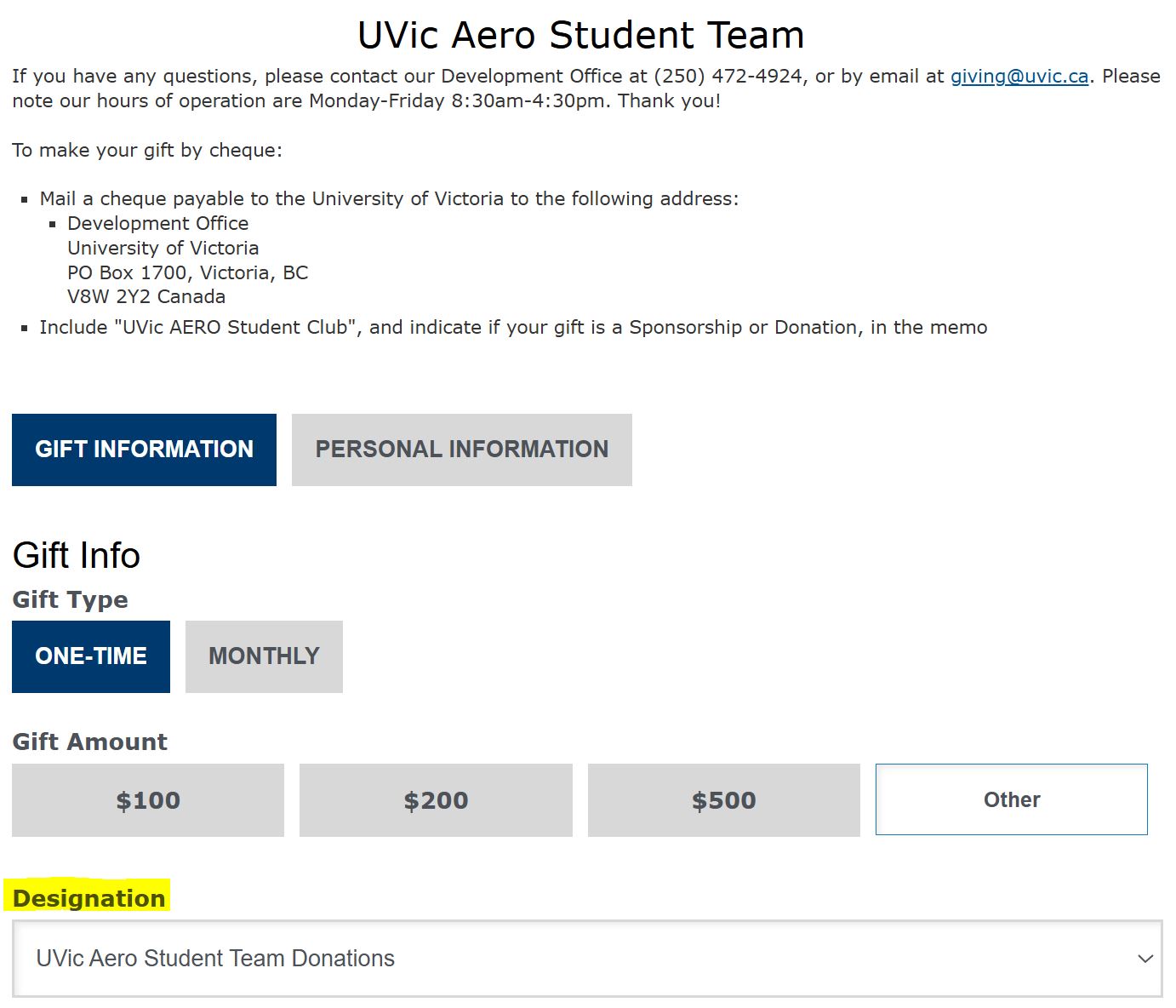 If your contribution is intended as a charitable donation, please ensure that when navigating the club fundraising page, the designation drop down is set to “UVic Aero Student Team Donations“